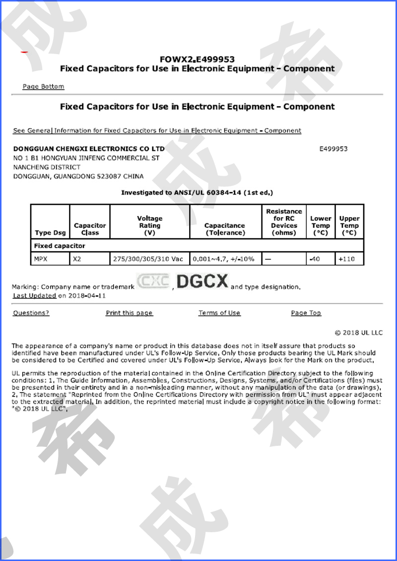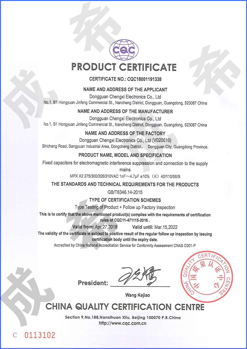公司通過ISO9001:2015質(zhì)量管理體系;ISO14001:2015環(huán)保管理認(rèn)證.安規(guī)X、Y電容、壓敏電阻通過CQC、UL/CUL、TUV、ENEC等安全認(rèn)證,產(chǎn)品符合RoHS、REACH、HF環(huán)保認(rèn)證。